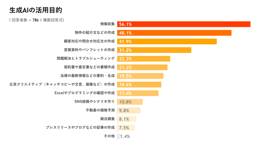 活用 / 予定 / 検討、過去に活用していた生成AIについて聞くと「ChatGPT」が85.5%と昨年に続き最多だった一方、「Gemini」が昨年10.6%から約4倍の38.8%に増加。生成AIの使い分けや多様化も進んでいることが分かりました。また、生成AIの活用方法について聞くと、過半数である56.1%が「情報収集」に活用していることが分かりました。さらに「物件の紹介文などの作成」は48.1%、「顧客対応や問合せ対応文の作成」は41.9%など、主に文章作成で生成AIを活用していることが分かりました。