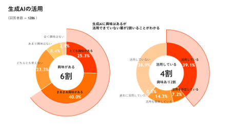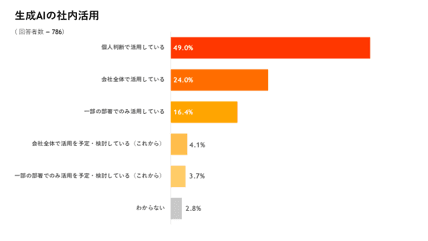 生成AIの活用に関しては65.3%が興味があると回答。所属する会社・部署ではどの範囲で生成AIを活用しているかの質問に対し、約半数となる49%が個人判断で活用、会社全体での活用は24%にとどまりました。一方で、現在活用しているかという質問に「活用している / 活用予定」と答えたのは46.3%と、「興味はあるが活用できていない層」が2割ほどいることが分かりました。