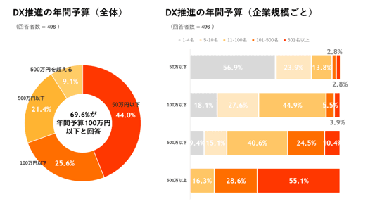 DX推進における年間予算は69.6%が100万円以下と回答。さらに予算ごとで区切ると、50万円以下と回答した人のうち従業員10名以下の企業が80.8%、501万以上と回答した人ののうち従業員101人以上の企業が83.7%と、会社規模によって年間予算に直結していることが分かりました。