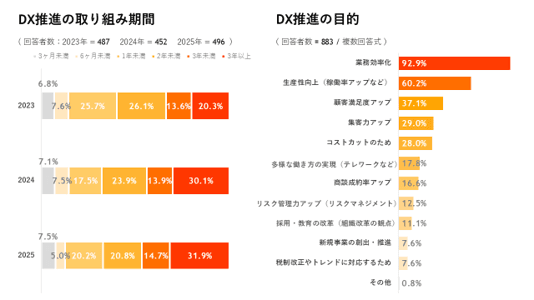 DXに取り組んでいる期間について質問したところ、「1年以上」が全体の約3分の2となる67.4%に。「3年以上」は31.9%で、DXを導入した多くの企業は継続して取り組みを続けていることが分かりました。また、DX推進の目的は、「業務効率化」が最も多く92.9%で、次いで「生産性向上」が60.2%、「顧客満足度アップ」が37.1%でした。
