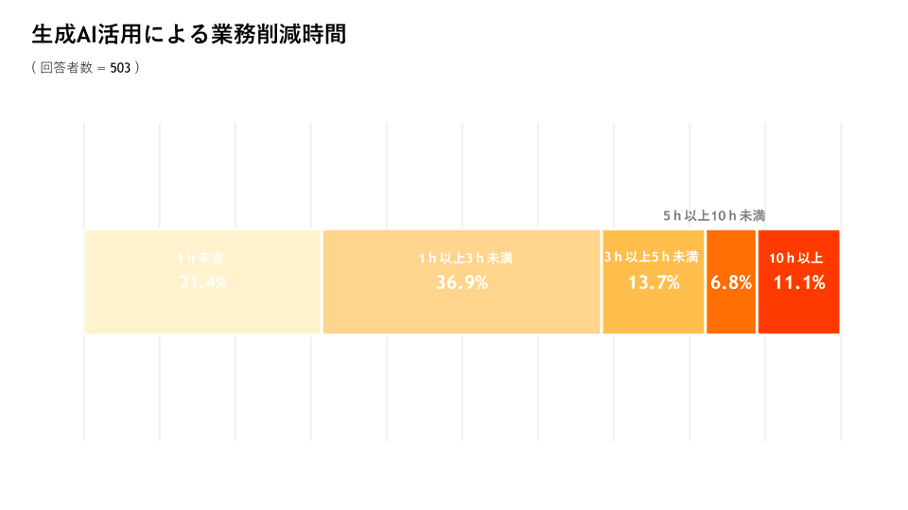 •11.1%は1ヶ月あたり10時間以上の業務削減を実現。一方で1時間未満が31.4%とAIの活用はまだまだ伸びしろあり