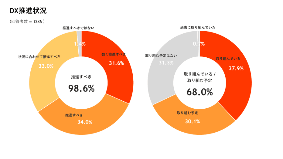 •DX を「推進すべき」は98.6%。「取り組んでいる / 取り組む予定」は68.0%