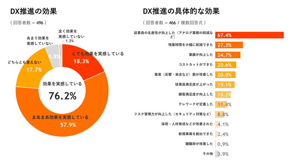 •DX経験者の76.2%がDX推進の効果を実感。得られた効果の上位は「従業員の生産性向上」「残業時間の削減」「業績の向上」