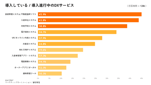 現在導入中または導入進行中の不動産テックシステムについて質問したところ「賃貸管理システム/不動産基幹ソフト」が最も多く45.9%、次いで「入居申込システム」が43.8%、「内見予約システム」が38.8%、「電子契約システム」が34.1%でした。