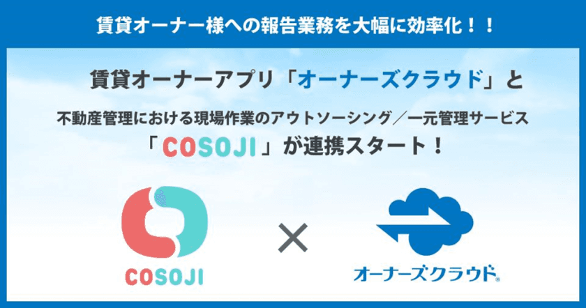 「情報の一元管理(SaaS)」と「現場業務のアウトソーシング(BPO)」の提供により不動産管理の課題をワンストップで解決できるサービス「COSOJI」を運営するCOSOJI株式会社(本社:東京都千代田区、代表取締役:富治林 希宇)と、賃貸オーナーとのコミュニケーションを完全DX化するオーナーアプリ「オーナーズクラウド」を運営する株式会社L&F(本社:千葉県千葉市、代表取締役社長 森 久純)は、両社のサービスを連携したソリューションを開発、提供を開始いたします。