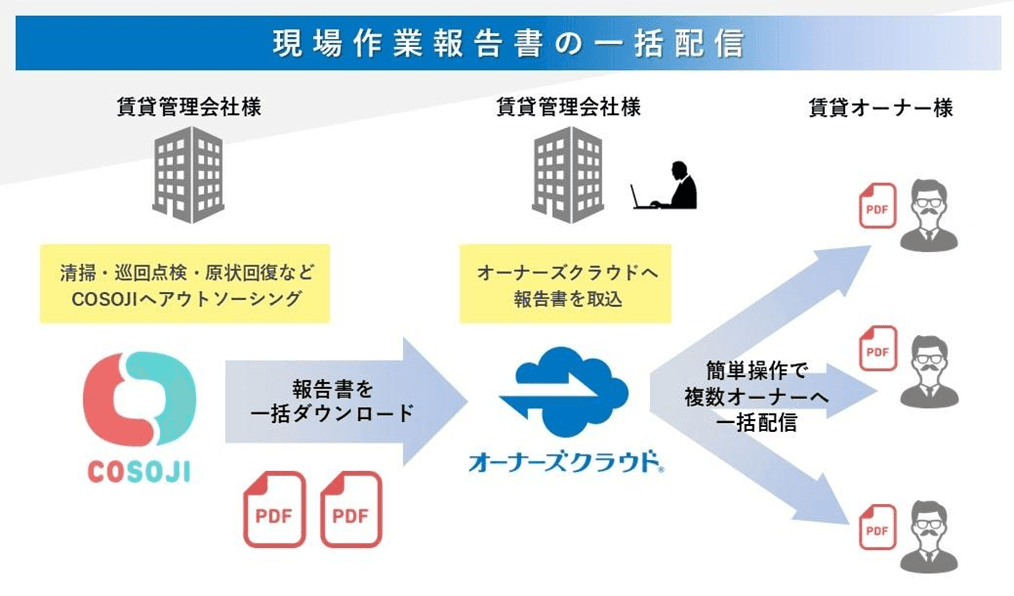 本連携により、「COSOJI」で自動作成された巡回点検、日常清掃、原状回復など様々な現場作業の報告書(PDF)を、「オーナーズクラウド」上での簡単操作で、賃貸管理会社様が複数の賃貸オーナー様へ一括配信することが可能になります。よって、オーナー様一人ひとりに報告書をメール送付したり、郵送する必要はなくなり、オーナー様への報告業務の大幅な効率化を実現できます。
