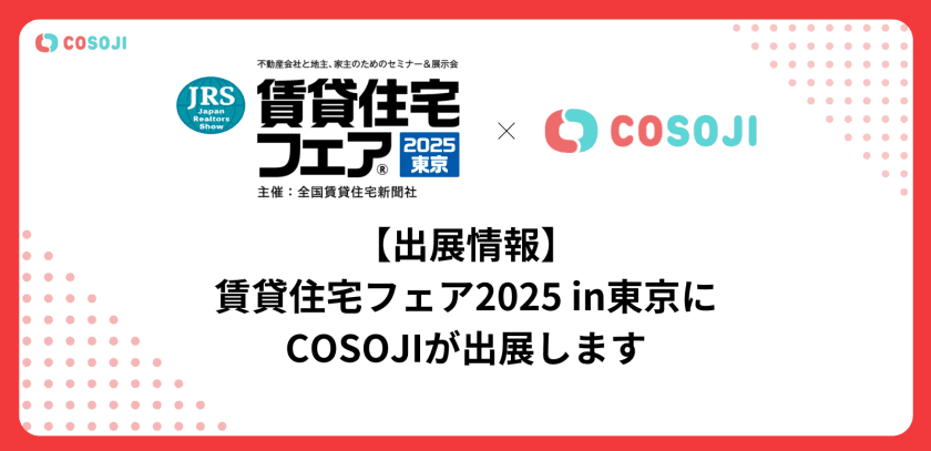 2025年9月17日(水)~18日(木)に東京ビッグサイトで開催される、全国賃貸住宅新聞社主催『賃貸住宅フェア2025』にCOSOJIが出展いたします。