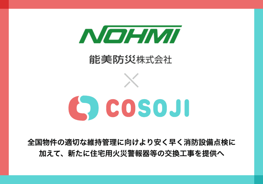 防災事業のパイオニア「能美防災株式会社」と不動産管理サービス「COSOJI」が連携開始。全国物件の適切な維持管理に向け、より安く早い消防設備点検に加えて、新たに住宅用火災警報器等の交換工事を提供へ