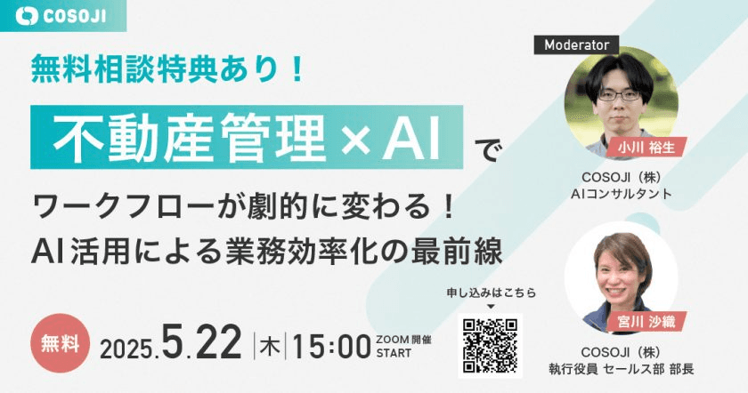 2025年5月22日(木)に、「不動産管理×AIでワークフローが劇的に変わる!AI活用による業務効率化の最前線」をテーマに、AI技術を活用した不動産管理の効率化を考えるウェビナーを開催いたします。