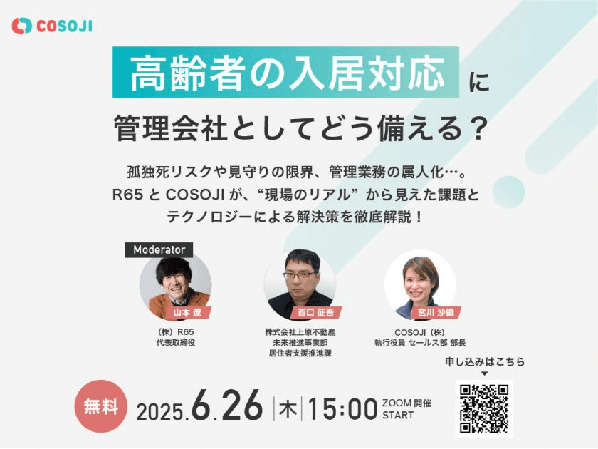 2025年6月26日(木)にCOSOJIカフェ『高齢者の入居対応に管理者としてどう備える?』~孤独死リスクや見守りの限界、管理業務の属人化…。R65とCOSOJIが、“現場のリアル”から見えた課題とテクノロジーによる解決策を徹底解説!~をテーマにウェビナーを開催いたします。