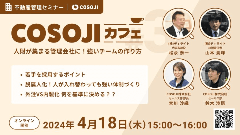 024年4月18日(木)、「第3回COSOJIカフェ~人財が集まる管理会社に!強いチームの作り方~」をテーマとしたWebセミナーを開催します。