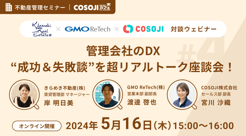 2024年5月16日(木)、「第4回COSOJIカフェ〜管理会社のDX “成功&失敗談”を超リアルトーク座談会!〜」をテーマとしたWebセミナーを開催します。
