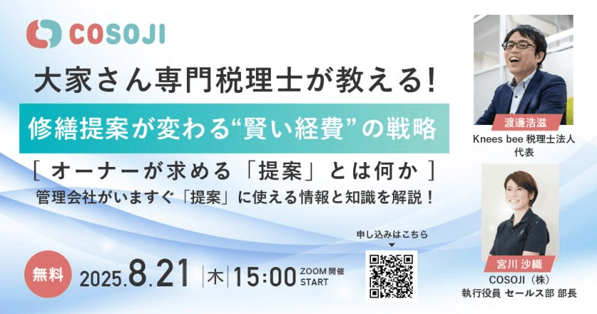 2025年8月21日(木)に、「大家さん専門税理士が教える!修繕提案が変わる“賢い経費”の戦略」をテーマに、第13回COSOJIカフェを開催いたします。