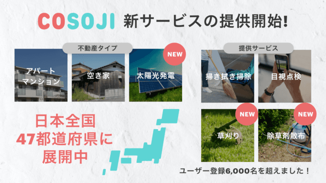 ※なお、今後『COSOJI』は不動産タイプ・サービス内容・エリアのそれぞれに対し順次拡大中です。公式アカウントにご登録頂くことで、先行してサービスリリースをご案内させて頂きます。